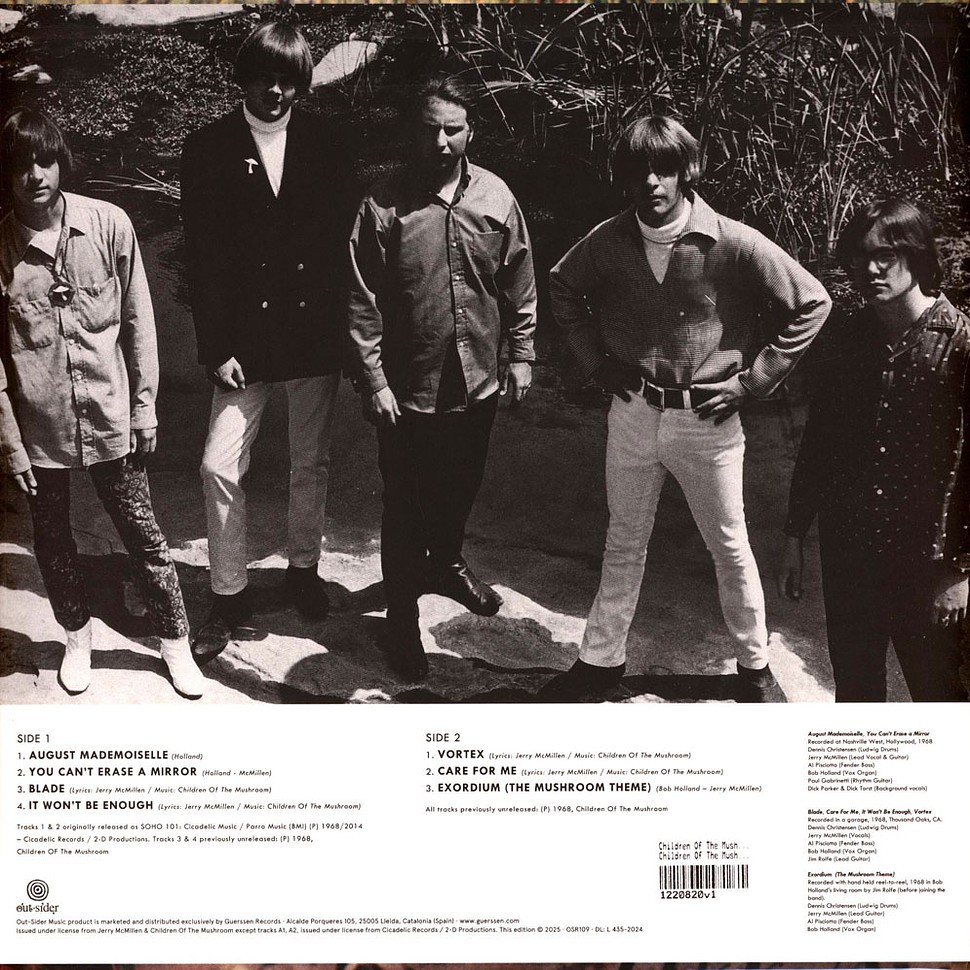 With only one 45 released back at the time, Children Of The Mushroom epitomized the psychedelic-garage sound coming out from California in the late 60s. Formed in Thousand Oaks by Jerry McMillen and Dennis Swanson, they evolved from a mid-60s teen-beat band called The Captives. In 1967, they became Children Of The Mushroom, a name which reflected their new psychedelic sound and image. The following year, they caught the attention of a couple of young producers, who signed the band for a 45 release. Recorded in 1968 for Soho Records, “August Mademoiselle” / “You can’t erase a Mirror”, is one of the masterpieces from the first psychedelic era: feedback, fuzz, organ, mysterious vocals…