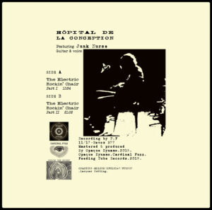 The gripping guitar tone enables Junk Nurse to so sharpen his style to the most expressive edge, as we also see him able to enter the realm of Guitar-Feedback loudness through a melodic door leading to a unique mastery in subtle & complex frequencies and, from there, to definitely unfold such an onslaught of guitar sounds as scary as dazzling for the senses. Directly mastered from reel tape, Hôpital De La Conception’s The electric rockin’ chair is an inspirational journey through the meanders of intense saturation & rumbling vibes, one of these rare ecstatic experiences to surface in our new Millenium.