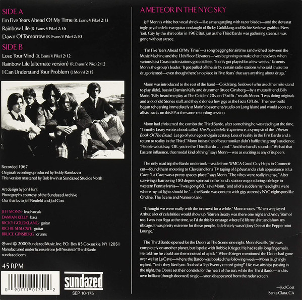 The short-lived but much-loved Third Bardo may have been Five Years Ahead of Their Time in 1967, but the world still hasn’t caught up! The New York quintet only existed for a brief period, during which they released one now-rare single. The Third Bardo’s entire recorded output amounts to six tracks, all cut on a single day in 1967, and produced, oddly enough, by former ’50s singer Teddy Randazzo, best known for the hits he wrote for the decidedly non-psychedelic Little Anthony and the Imperials.